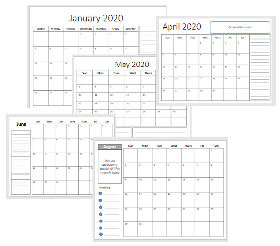 - 5 wall calendar templates, landscape format, Sunday start, Fully dated January-December 2020